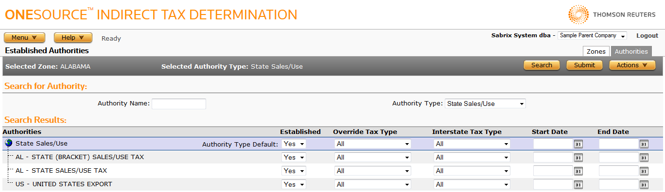 Use the Established Authorities page to specify the locations in which your company is established—resulting in tax reporting obligations. On the Authorities tab, you can customize your company's establishment settings within a selected zone.