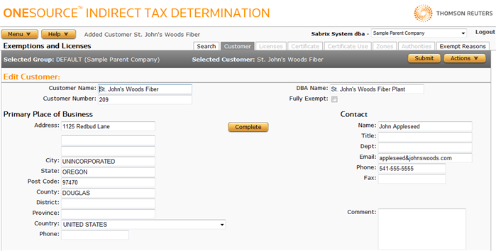 Use the Customer page to display and modify data about the currently-selected customer, or to add a new customer. You can also add both Exemption Certificates and Licenses associated with this customer from this page.