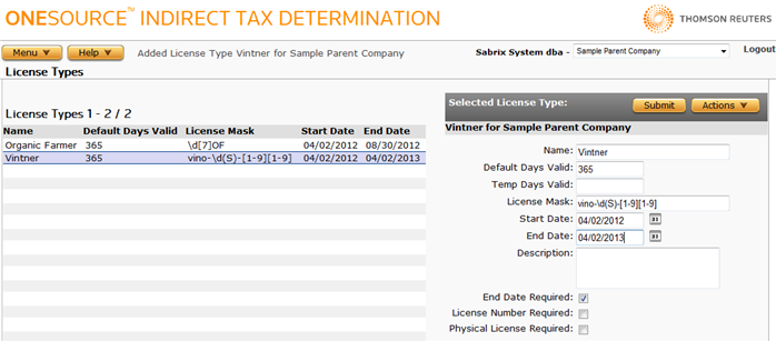 Use this page to manage or view the license types your company can use. Each license maintained in Determination must map to one of the configured license types.