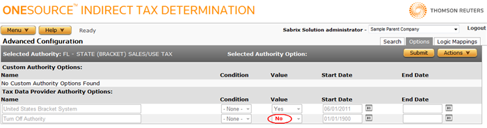 The US Bracket Authorities are included when you download current tax data content. The authorities are turned off by default. The user with the role of Tax Data Administrator will need to turn the bracket system on for each company that is doing business in a bracket jurisdiction. (If you have not been assigned the role of Tax Data Administrator, you must obtain it before you can turn on the authorities.)