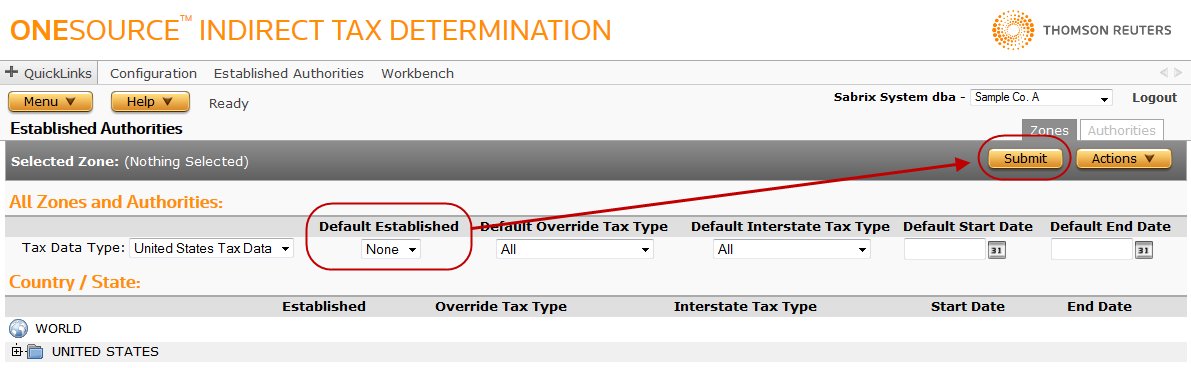 - Select None from the Default Established drop-down list, then click Submit. This turns off all establishments in the US.