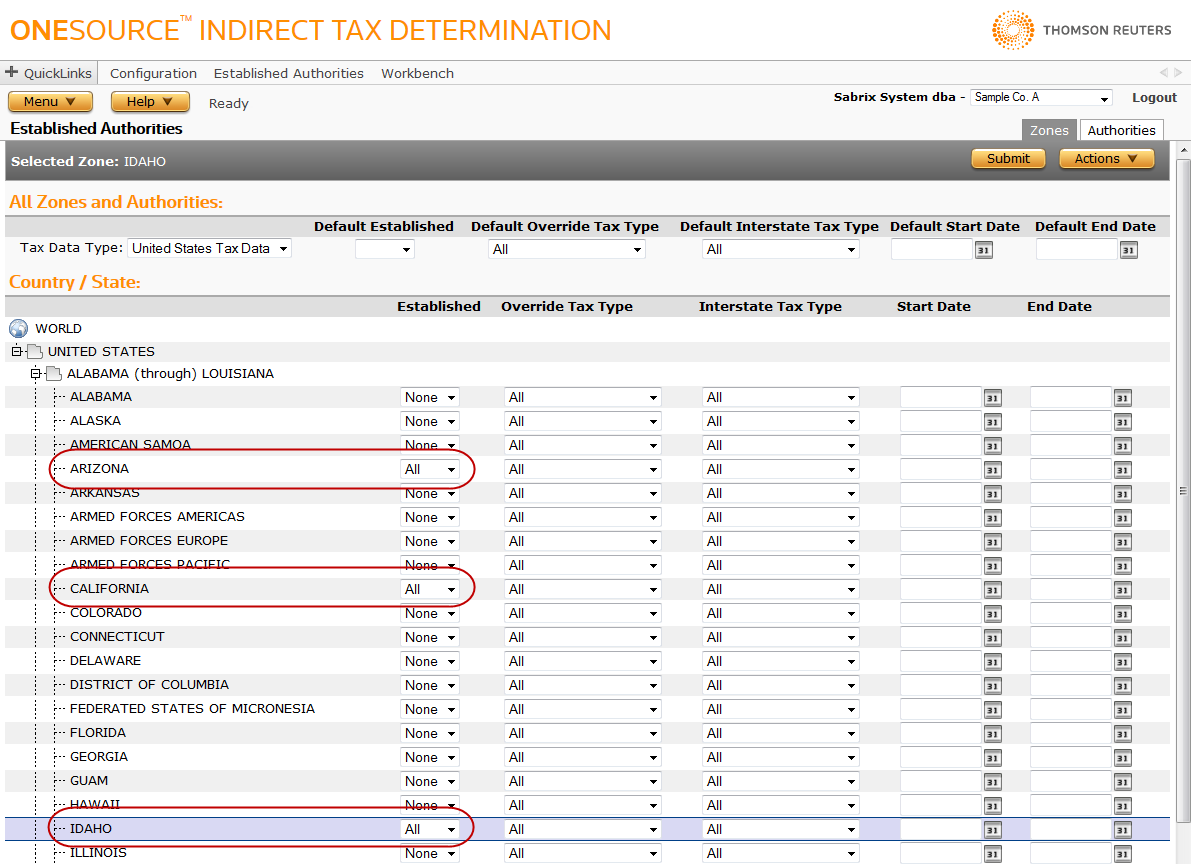 The date is January 10, 2015. You must configure a newly created Determination company, Sample Co. A, which has been doing business in Arizona and Idaho for several years. Sample Co. A is opening a new store in California on March 12, 2015. You have not changed the system defaults, so Determination will treat all US authorities as established unless otherwise specified. Follow the steps below to configure Determination.