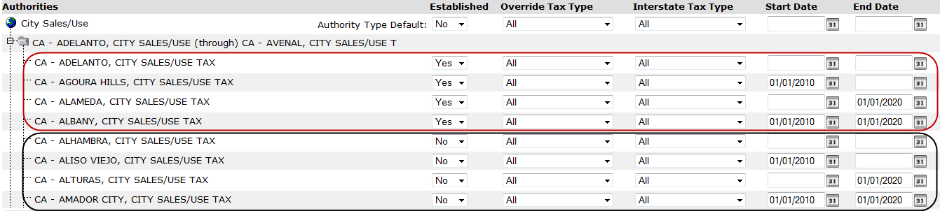 - Start and end dates will not be evaluated for the four City Sales/Use authorities circled in black because the establishment setting is not an exception to their parent, the Authority Type Default for City Sales/Use.