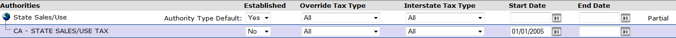For the configuration shown above, the CA - STATE SALES/USE TAX authority is established until January 1, 2005. The Start Date marks the beginning of the establishment setting of No. The date is evaluated because the establishment setting is an exception to its parent, the Authority Type Default for State Sales/Use.