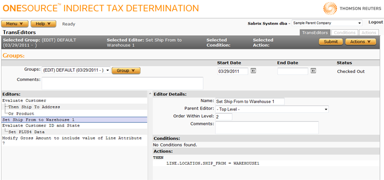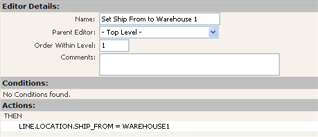 Because this TransEditor is at the top level, it will always be evaluated. Because it has no conditions, it always evaluates to true, and therefore the action of setting the value for Ship From Location to WAREHOUSE1 will take place for every transaction. |
