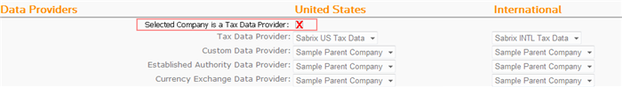 Check this box if your company is a tax data provider. Only top-level companies (directly beneath Administration in the Companies hierarchy) can make this selection. When checked, all other data provider selectors are deactivated. A single company cannot serve as both the International and US tax data provider. You must configure two distinct companies. |