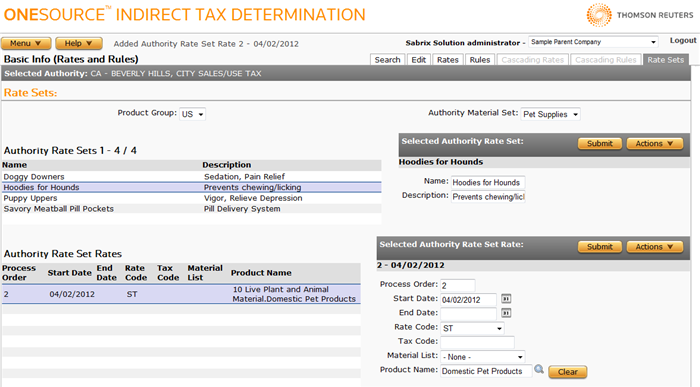Menu > Tax Data > Authorities > Basic (Rules and Rates) > Rate Sets