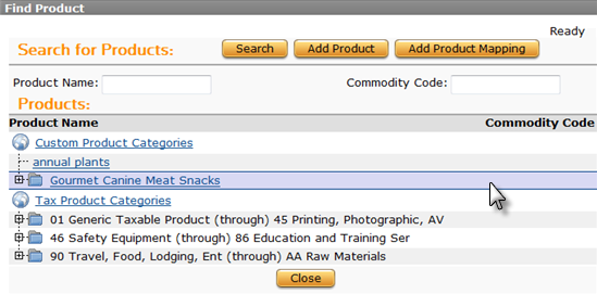 In this example, the Gourmet Canine Meat Snacks row is selected. When you click a row, the Add Product and Add Product Mapping buttons become available.