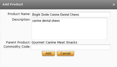 - In the Add Product window, enter the Product Name and Description. The Parent Product is the name of the row you selected.