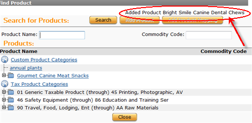 - Click Add to add the new product and return to the Search window. The new product is identified in the top right of the window. Click Close.