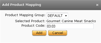 - In the Add Product Mapping window, select a Product Mapping Group, if different from Default, and then enter a Product Code.