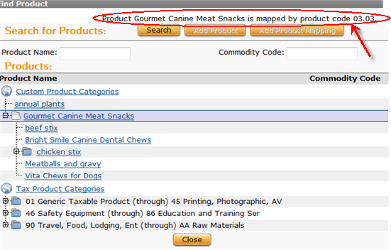 - Click Add to add the new product mapping and return to the Search window. The new product mapping is identified in the top right of the window. Click Close.