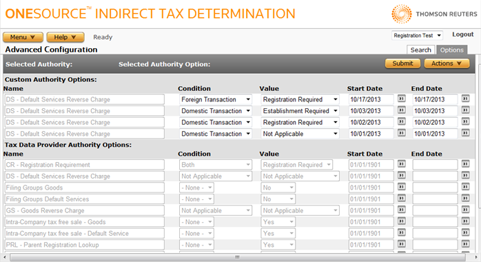 To change the behavior of standard authorities, you create custom authority options from copies of the tax data provider authority options. These custom options override the tax data provider authority options. For custom authorities, you make changes directly to the option values because there are no tax data provider authority options to override.