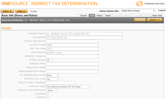 Use this page to view or update detailed information about the selected authority. You can only edit authorities owned by your company: a Tax Data Provider can modify the TDP authorities it owns, a Custom Data Provider can modify the custom authorities it owns, and for other companies, this page is view-only.