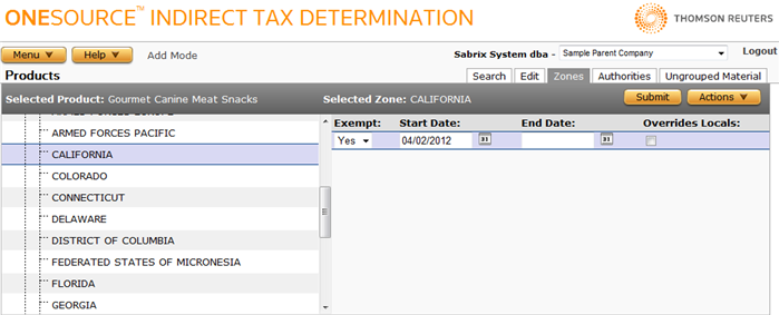 Use this page to add a full product exemption for the selected custom product in one or more zones. You can also select specific authorities attached to the specified zone. The exemption applies to the specific line and its related lines. For example, if a product is exempt from tax, a related freight line is also exempt.