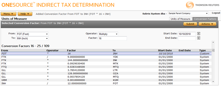 ONESOURCE Indirect Tax Determination provides a list of default conversion factors (indicated by the label System in the Type column. You can add your own custom conversion factors (indicated by the label Custom in the Type column), or redefine these default conversion factors by adding a custom override.