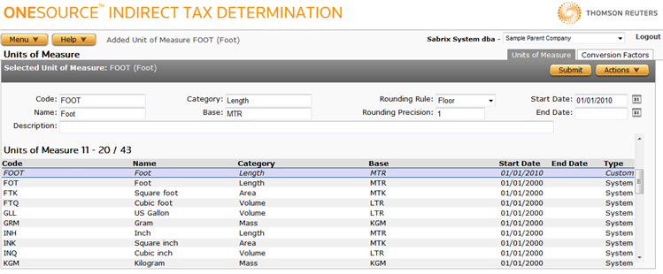 ONESOURCE Indirect Tax Determination lists default units of measure, as indicated as System in the Type column, as shown below. You can add custom units of measure, or redefine the default units of measure by adding a custom override. When you do, these units of measure are listed as Custom in the Type column.
