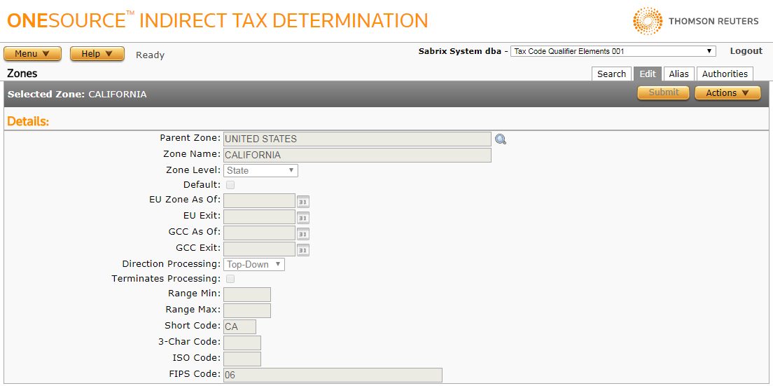 This field indicates that this zone terminates the authority processing during tax calculation. If selected, this zone will be the last one processed on transactions that involve this zone. For example, if in Ontario this field was selected (and reverse processing were on for Canada) the Ontario tax authority would be used and the Canada level tax authority would not be used. If this flag were not selected then both the Ontario and Canada tax authorities would be applied to the transaction. |