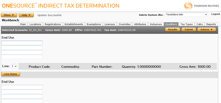 The <END_USE> input XML tag at the Invoice and Line Levels can be configured to drive the taxability of the associated product using rule qualifiers. Use this page to enter any End Use values needed to complete this scenario at the Invoice or Line levels.