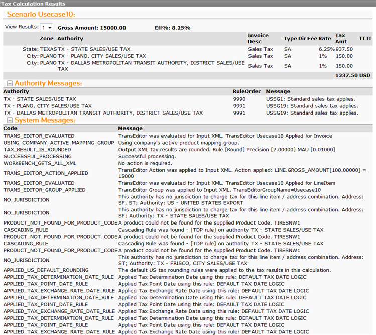 When you click the Results button in the Selected Scenario section of the Workbench page, you will see tax calculation details for the most recently submitted version of the scenario.